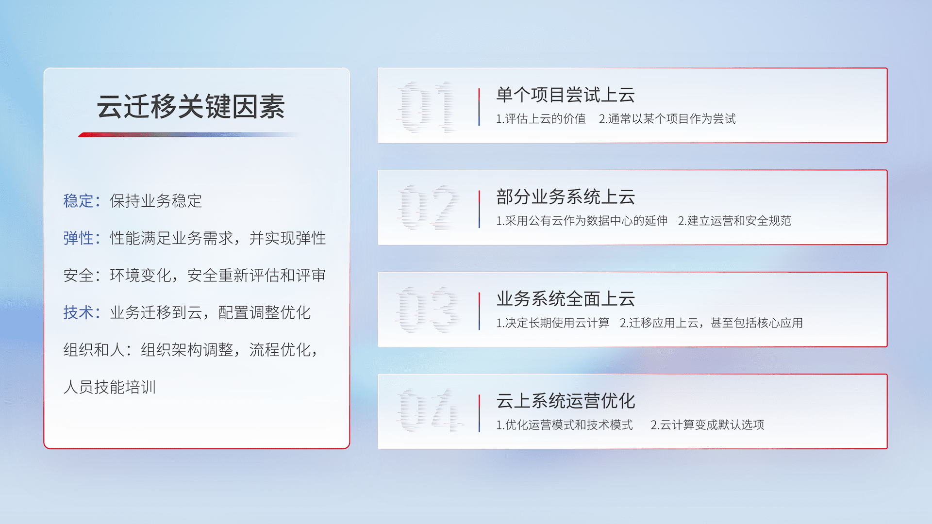 结合实际业务,,,,从规划设计、、、、云平台选型、、、、云原生改造、、、、数据迁移、、、集成交付,,迁移全过程为客户识别最佳上云路径,,做好风险识别管理,,,,设计网络架构、、、、身份权限、、、、安全审计合规、、操作审计、、日志审计、、、、监控告警策略、、多站点容灾设计等,,,,对云上基础设施进行整体规划,,提升IT治理水平,,,以满足弹性、、、、高可用、、、、高性能的需求。。。